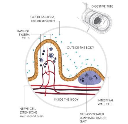 Deeper within the wall of the intestines the immune system is housed in the form of lymph nodes in what is called the Gut Associated Lymphatic Tissue (GALT). The deeper levels of the intestinal walls also content the Enteric Nervous System (ENS) which is a nervous system dedicated to the gut itself and is only partially controlled by Central Nervous System (CNS).